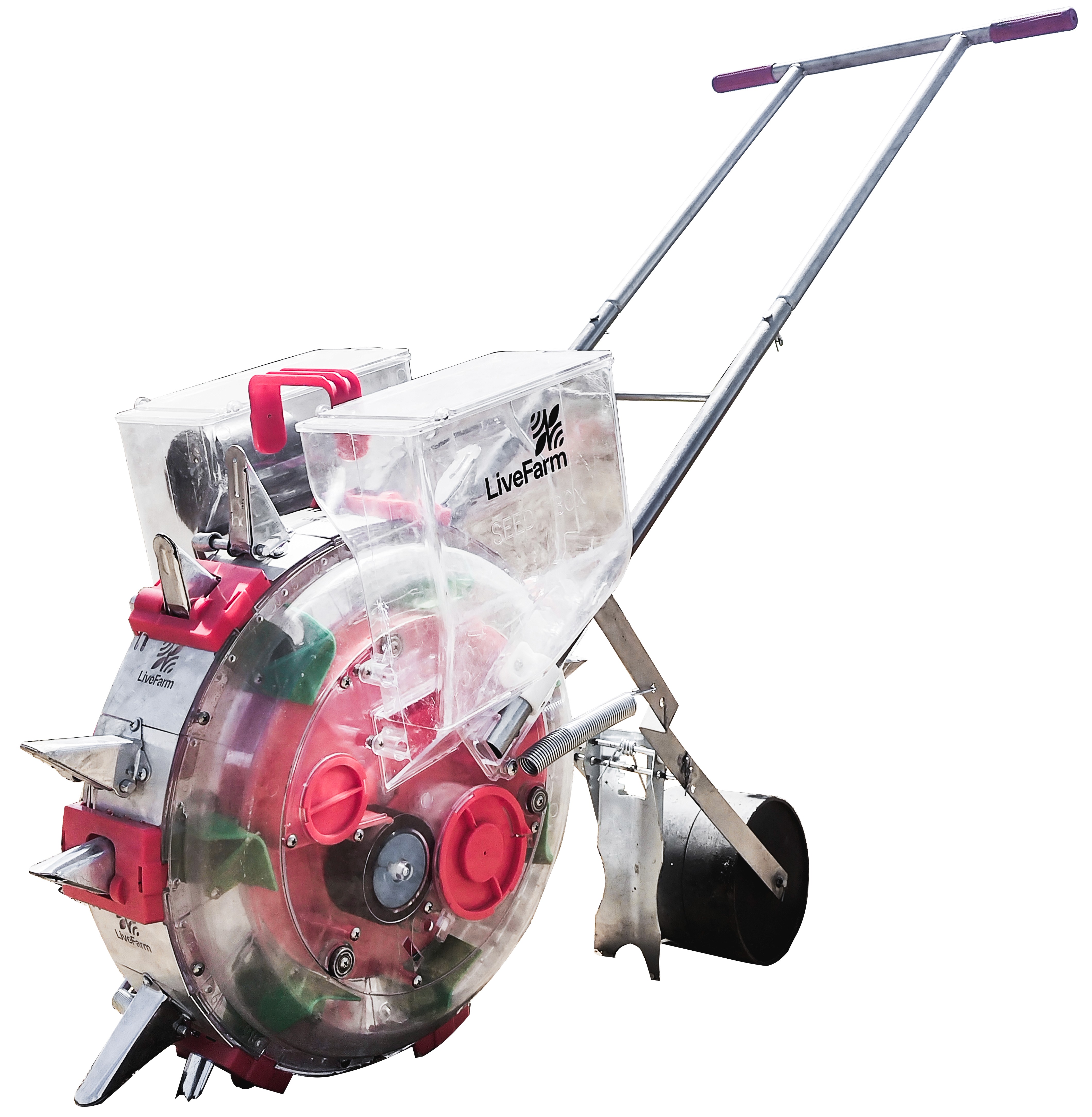 Até mesmo plantas maiores como abóbora, melancia e pepino podem ser plantadas usando a máquina. Para cada tipo de semente existe um disco especial com furos do tamanho adequado. A máquina vem com vários discos diferentes, permitindo que você plante desde sementes muito pequenas, como as de capim, até sementes grandes como as de milho.