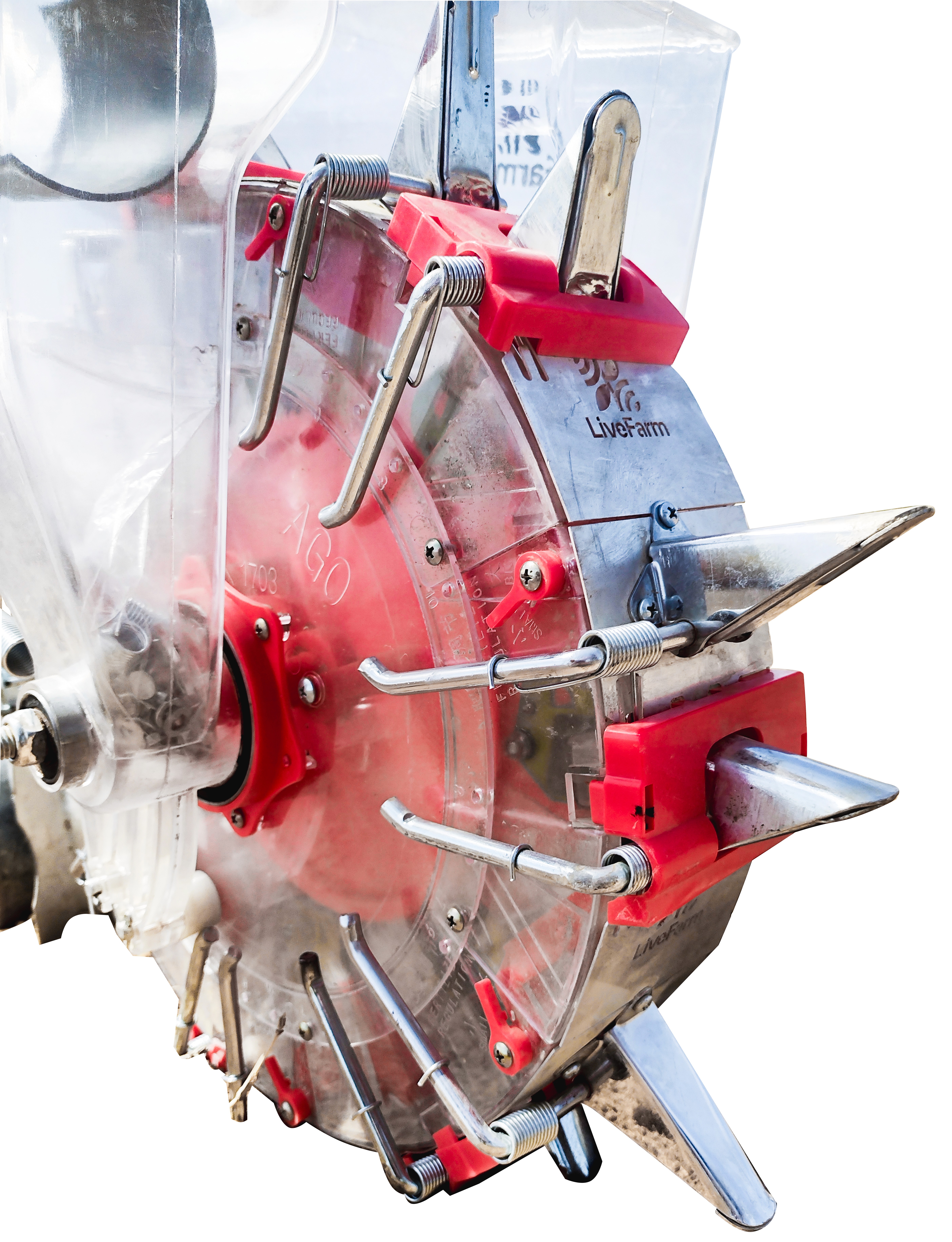 Cada bico já tem seu controlador de profundidade. Também vem 1 disco liso e 11 discos com furos de diferentes tamanhos para trabalhar com vários tipos de sementes, desde capim, até sorgo, milho e abóbora.